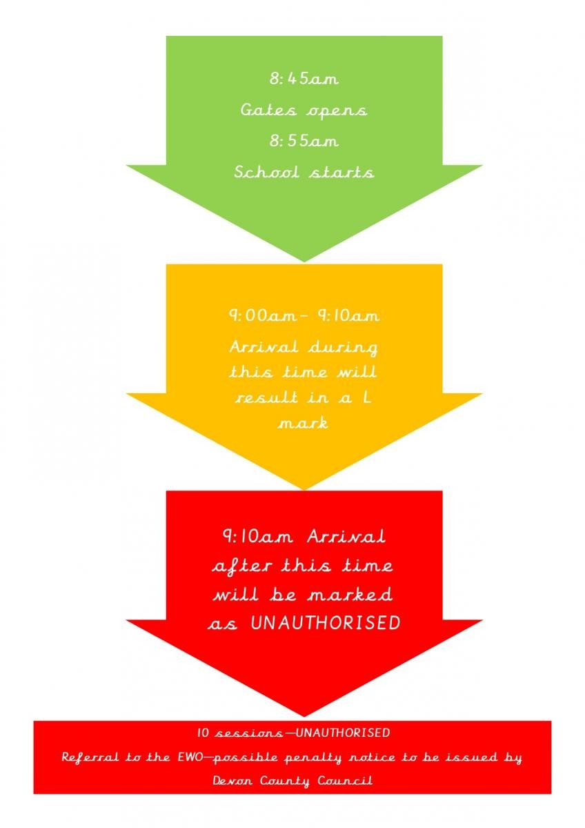School drop-off starts from 8:45am and children will need to be in school by 8:55am to start their lessons. Parents must drop off their child/ren off in the playground or at the gates where a member of staff will be present. Any child arriving between 9.00 and 9.10 will be marked as late and any child arriving after 9.10 will be marked down as an unauthorised absence.